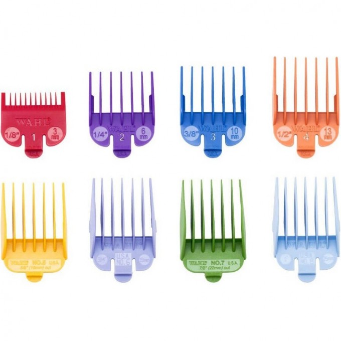 Набор из восьми разноцветных пластиковых насадок Wahl Colored Cutting Guides для машинок Wahl применяют для изменения длины стрижки от 3 до 25 мм. Цветные насадки Wahl разработаны для быстрого, гладкого и плавного скольжения через волосы или шерсть. Гребни без усилий крепятся на ноже и не соскакивают во время работы.